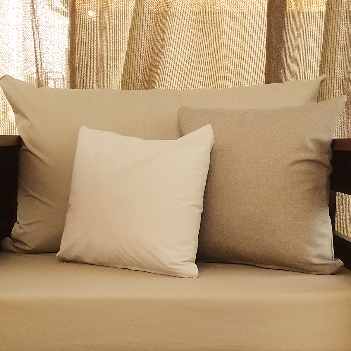 - Almohadón grande: 40x40 cm, cubierto con tela de Lino Outdoor, un material innovador y elegante que combina la naturalidad del lino con la resistencia y durabilidad necesarias para exteriores.