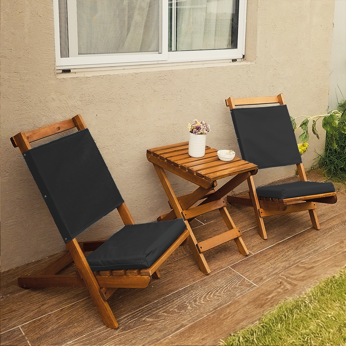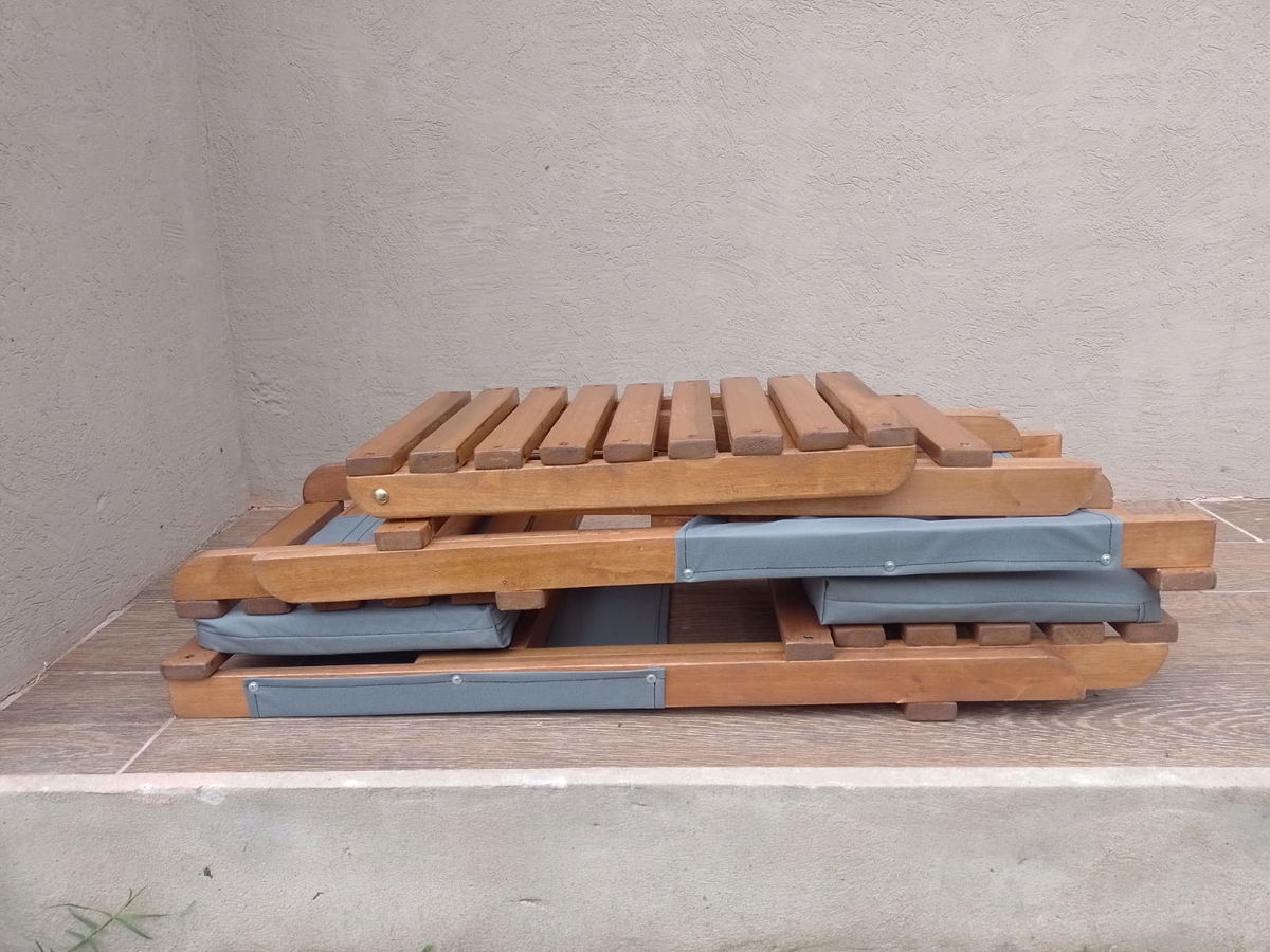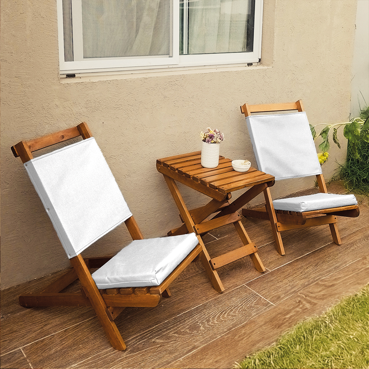 Confeccionado en madera de eucalipto y tela impermeable.(cordura), asiento en goma espuma de alta densidad.