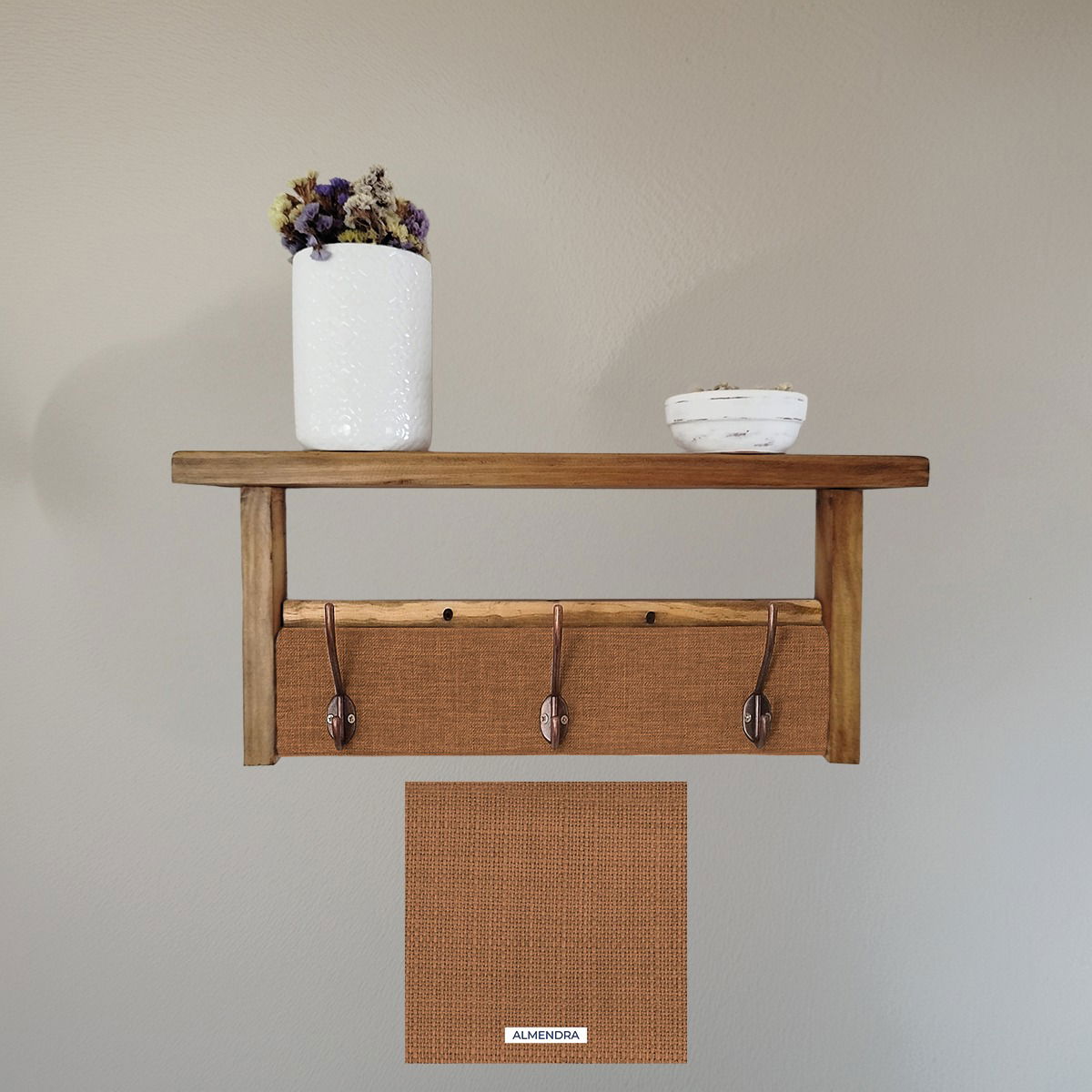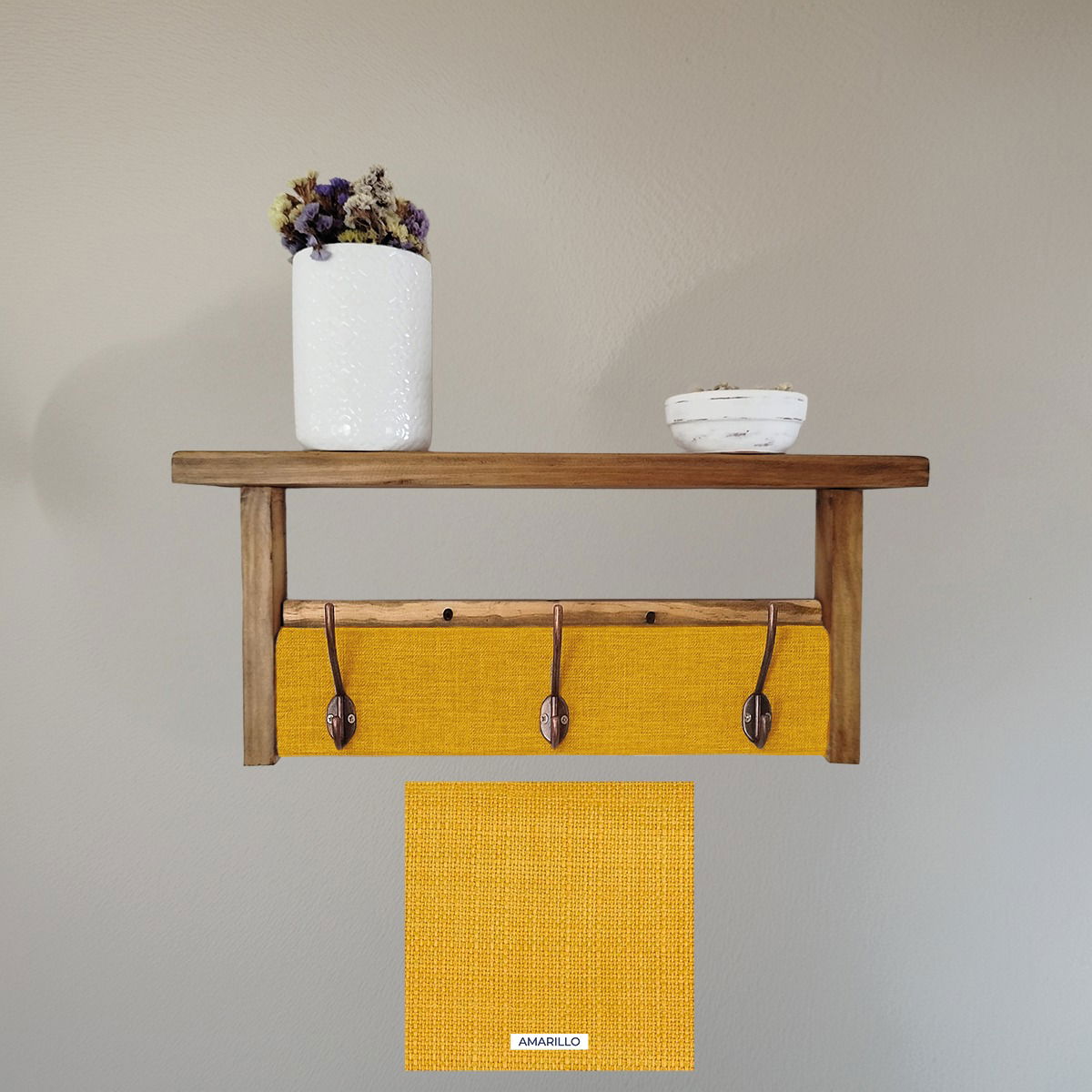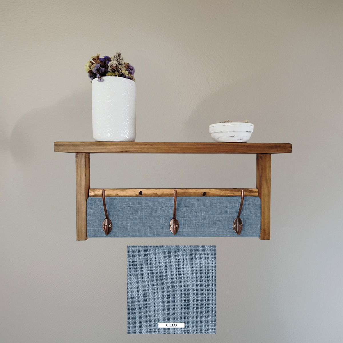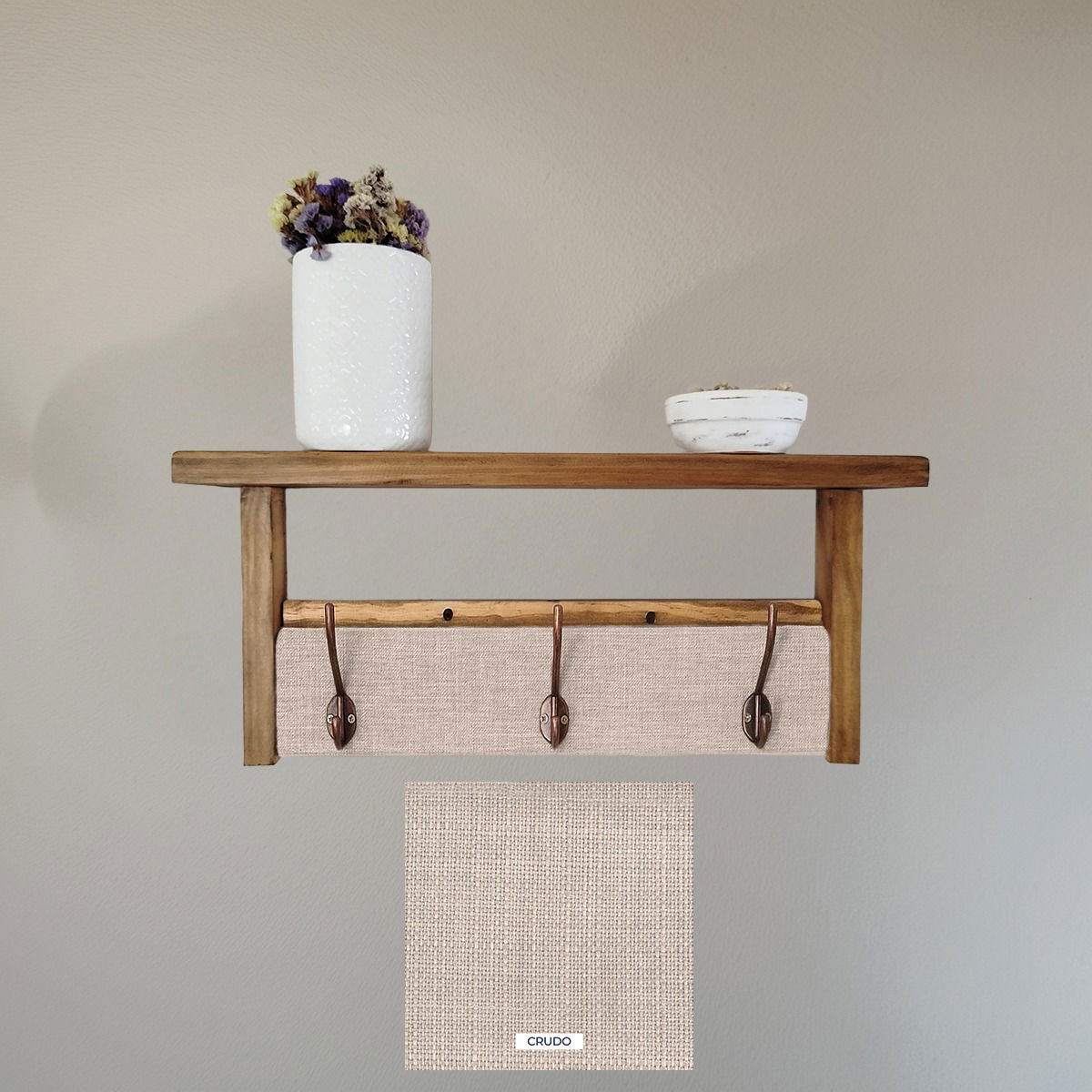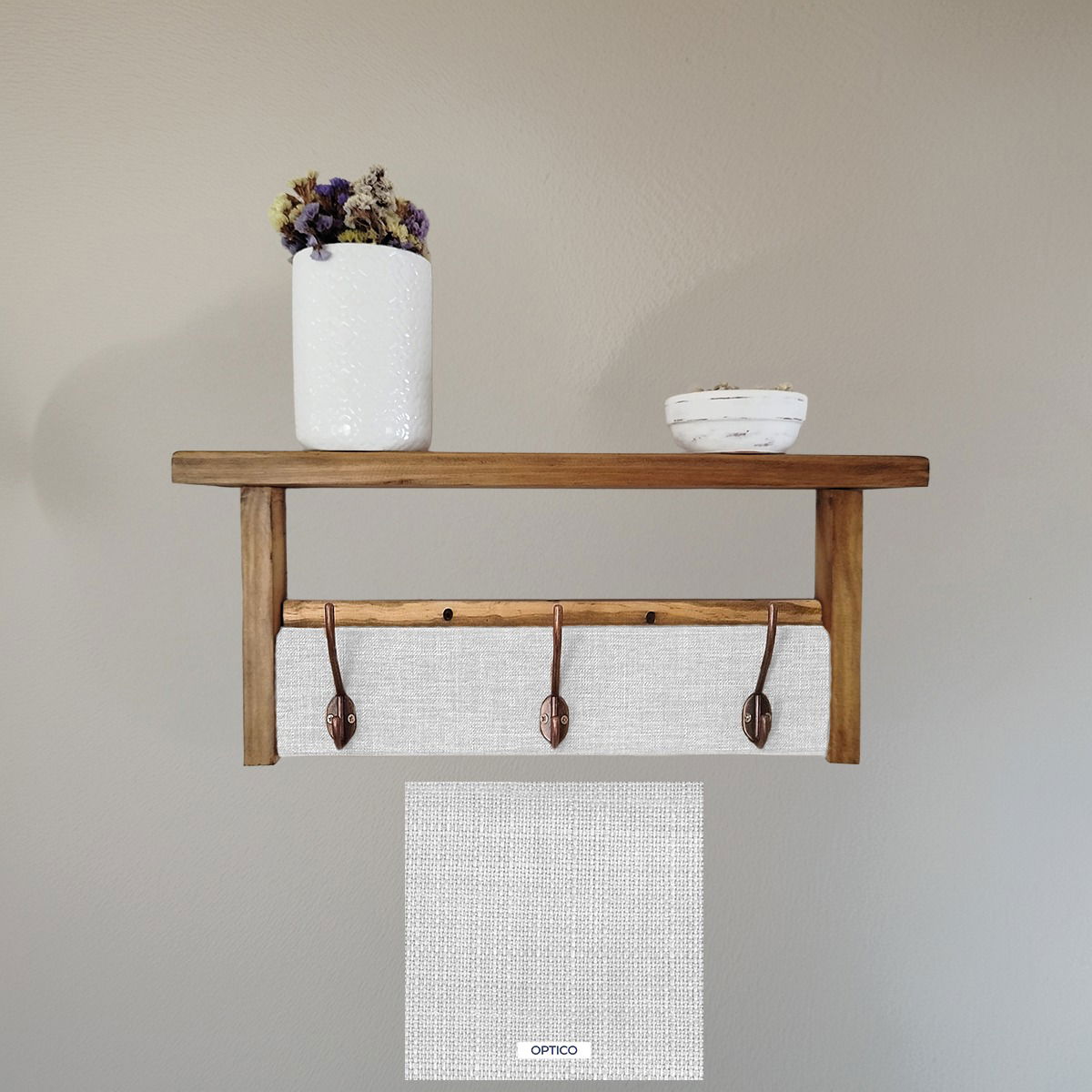 ¡solo necesitarás dos tornillos para colocarlo! Además, ofrecemos la posibilidad de elaboración personalizada. Puedes elegir las medidas y telas que mejor se adapten a tus necesidades y gustos, asegurando que tu perchero sea único y perfecto para tu hogar.