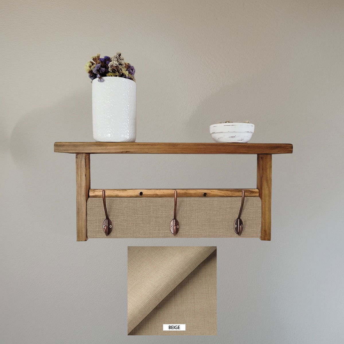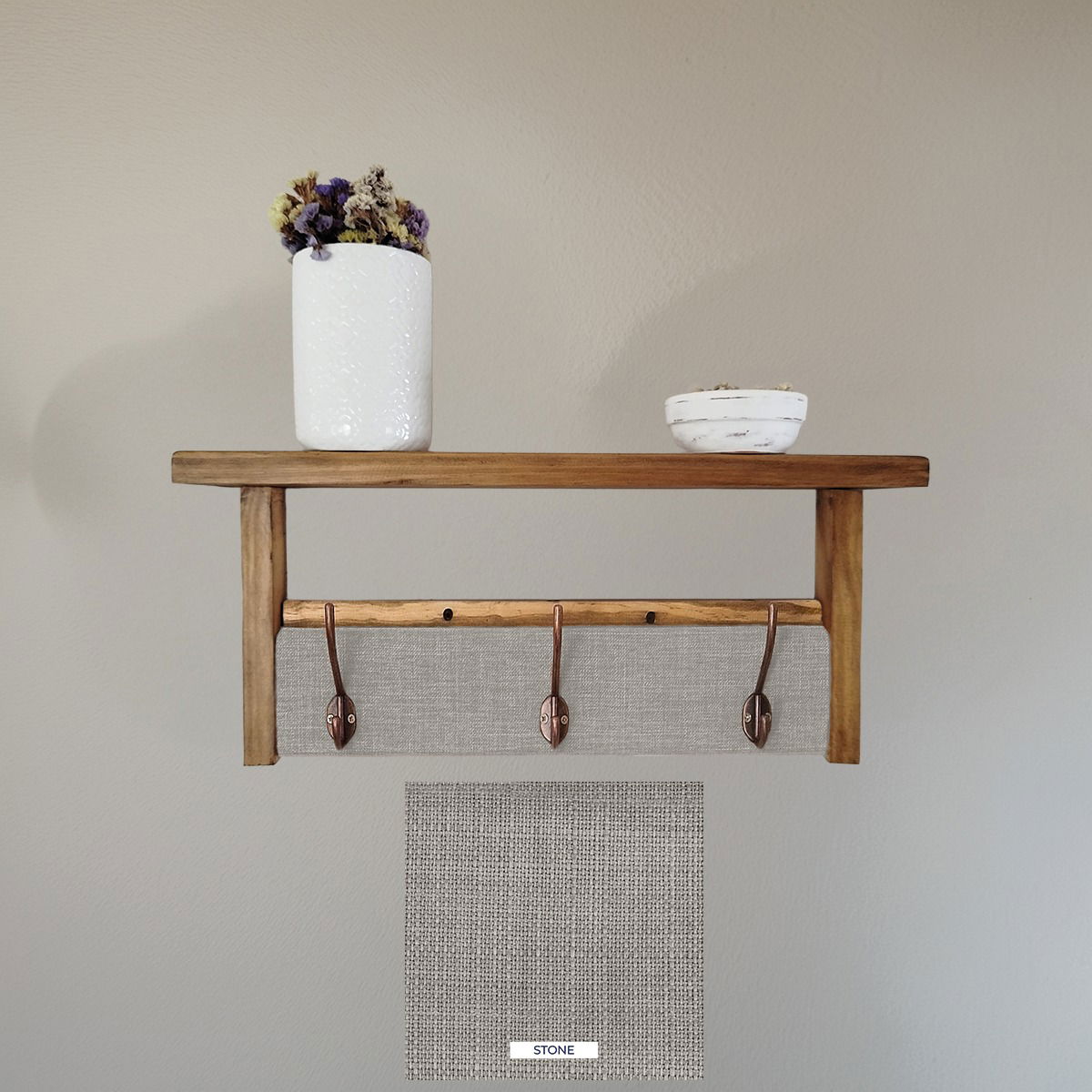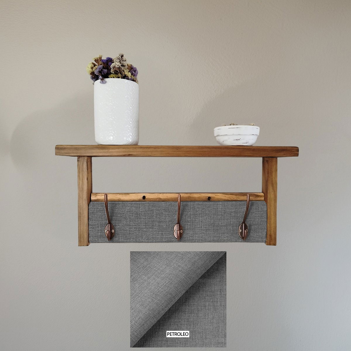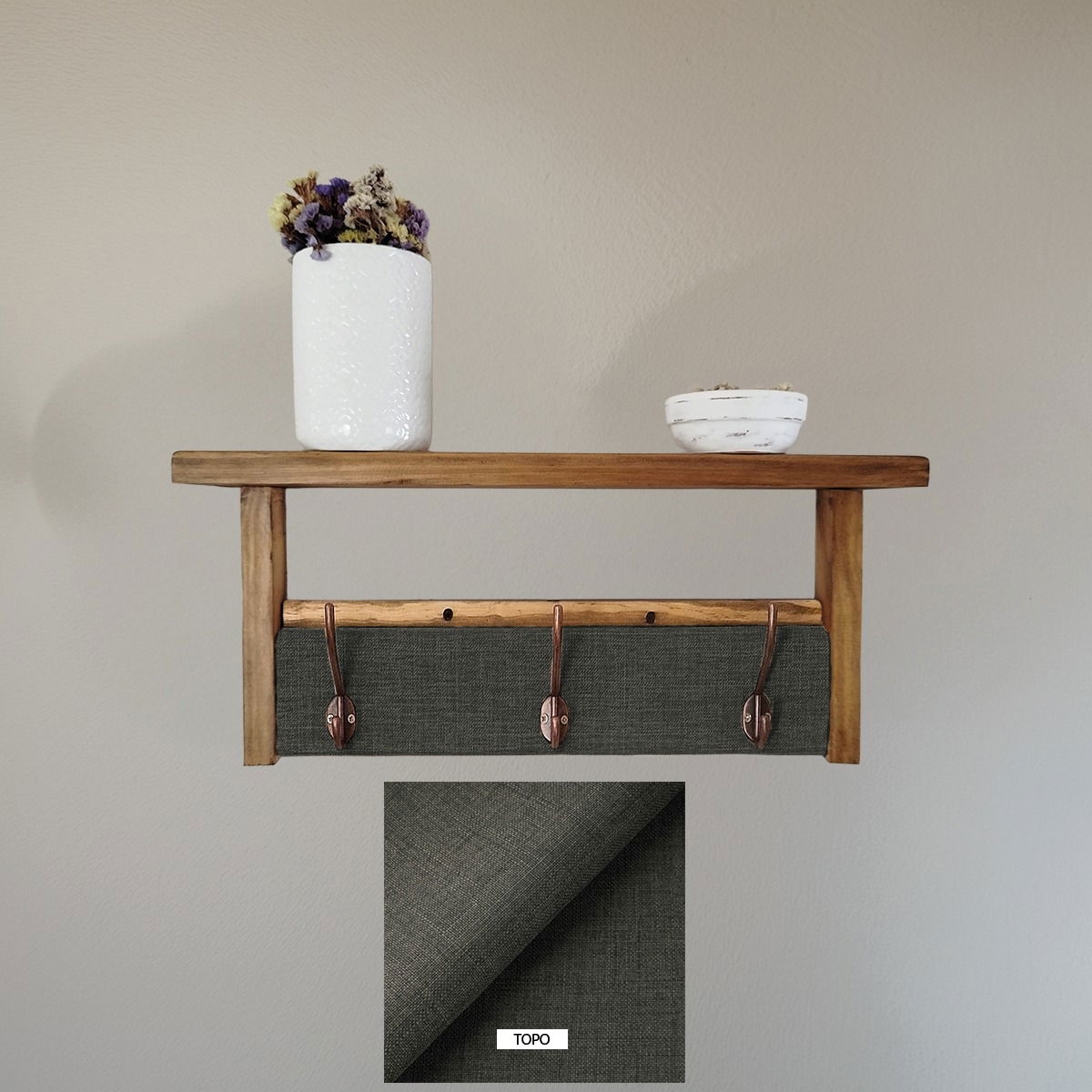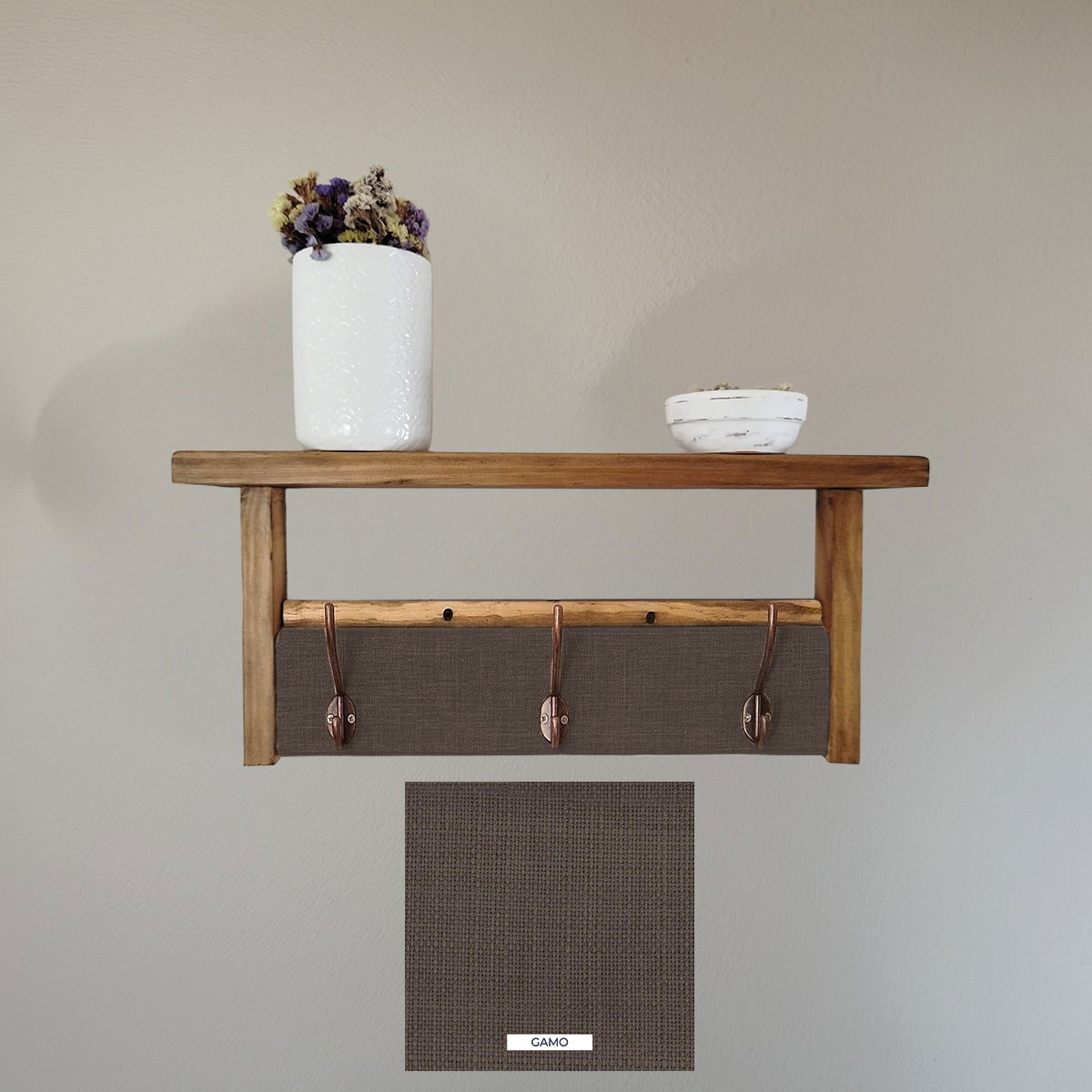 ¡solo necesitarás dos tornillos para colocarlo! Además, ofrecemos la posibilidad de elaboración personalizada. Puedes elegir las medidas y telas que mejor se adapten a tus necesidades y gustos, asegurando que tu perchero sea único y perfecto para tu hogar.