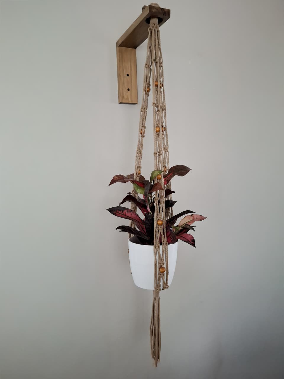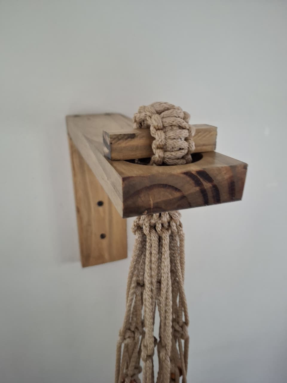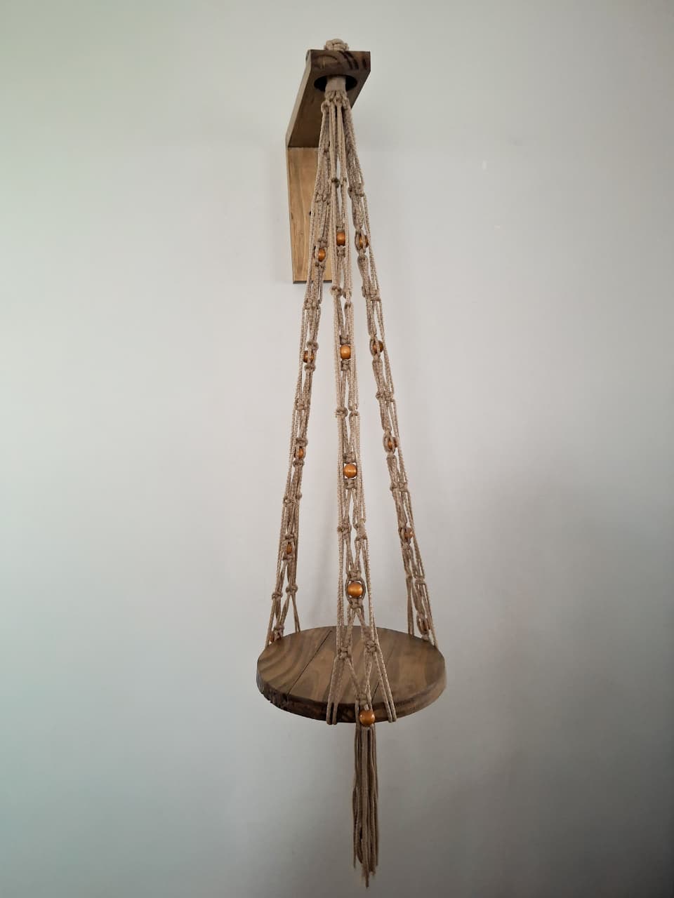 - Podes elegir entre un modelo que incluye un plato de madera de 25 cm de diámetro para apoyar tu maceta, o el modelo sin plato, donde podrás colocar la maceta directamente sobre el hilo según tu estilo personal.
